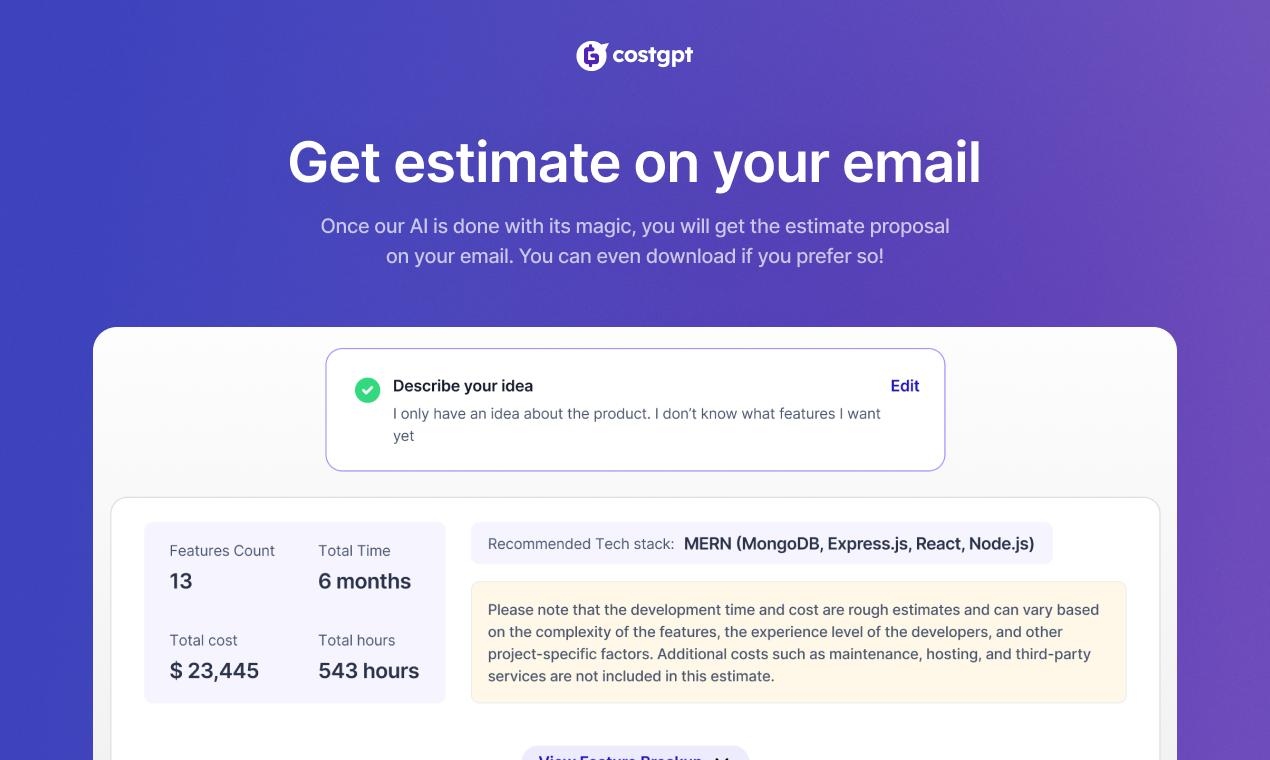CostGpt is an AI-powered Software Development Cost Estimator that helps you to Estimate Software Development Costs. Describe your idea & get Software Cost Estimation.